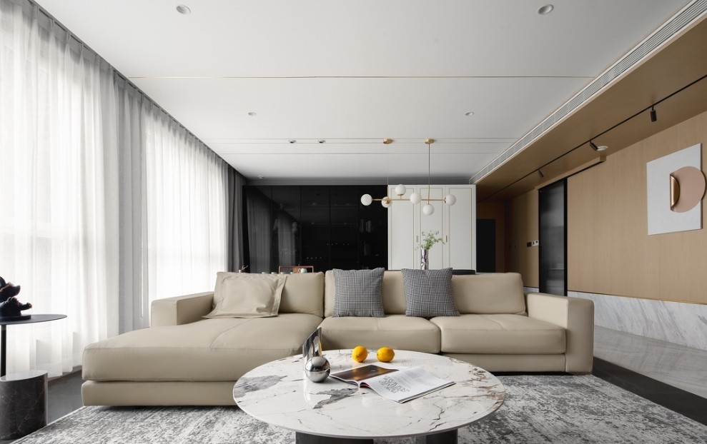 设计师没有给家中搭配太复杂的家具陈设,而是以简单舒适为原则,同时又能彰显品质和格调。米色定制款沙发、棕色的躺椅,暖色系家具装饰与周围环境构成了有深浅层次的呼应。