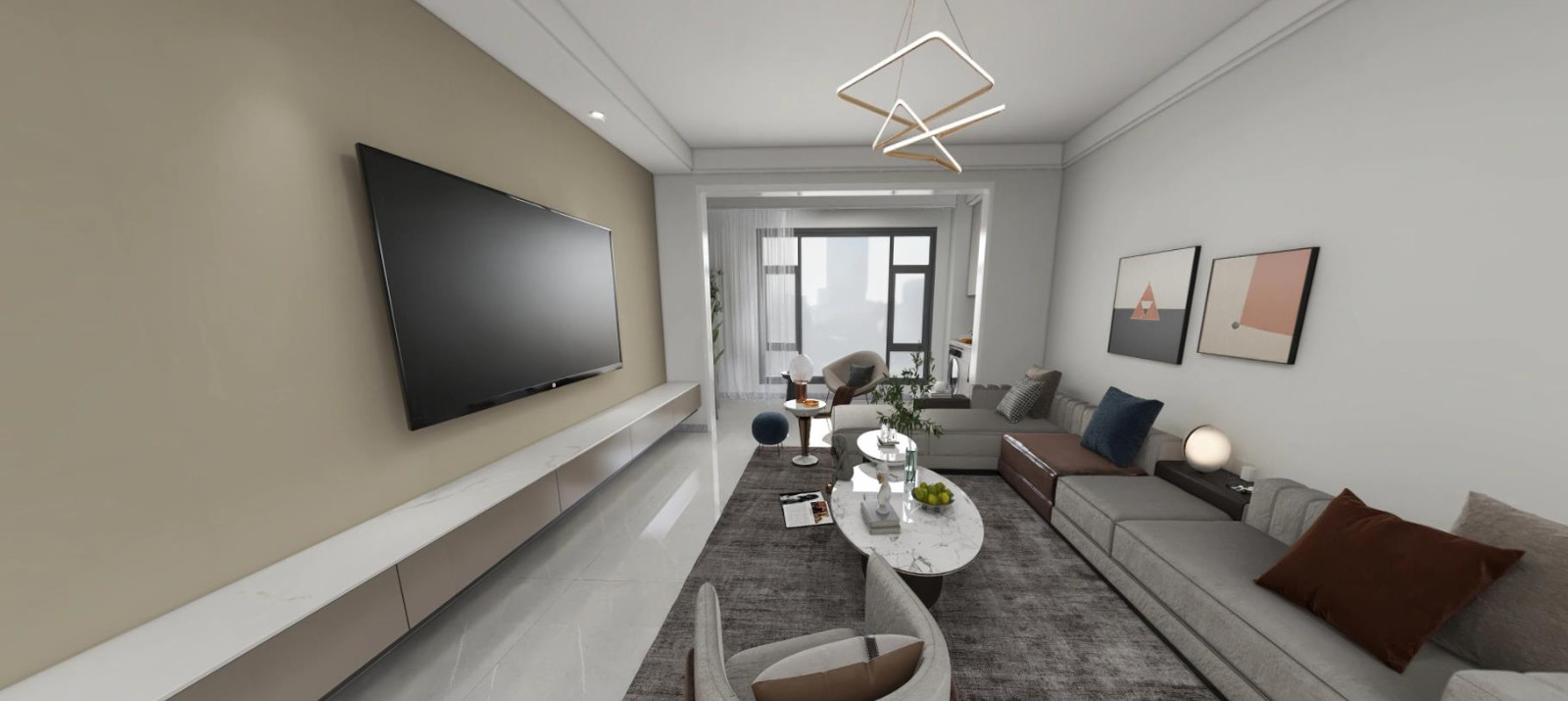 1.整体以浅灰色为基调的的现代风,奠定简约时尚的格调,小巧的岩板椭圆形茶几有着满满精致感,电视背景墙采用暖色调乳胶漆通刷,并采用凹进去的造型设计,与白色墙面形成色彩反差 2.灰色的亮面地砖通铺全屋,与顶部的白色双眼皮吊顶形成灰白相应,显得空间大气宽敞,沙发则选择深色系的贵妇沙发,整体实用性强,也给空间增添了几分质感