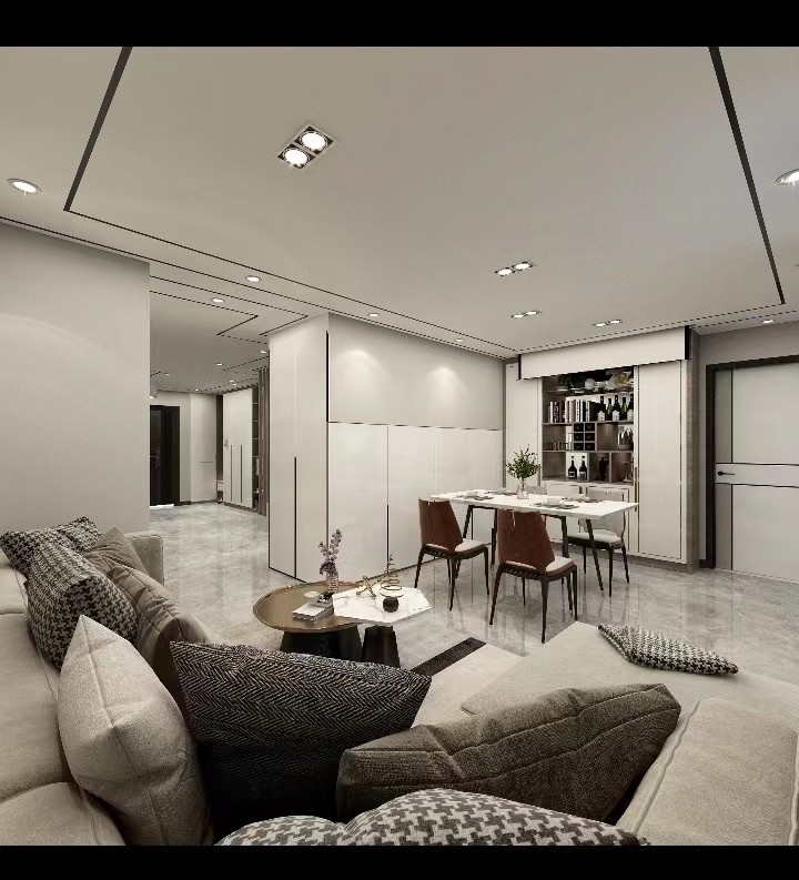 整体风格为现代简约,轻装修重装饰,强调收纳空间的设计。