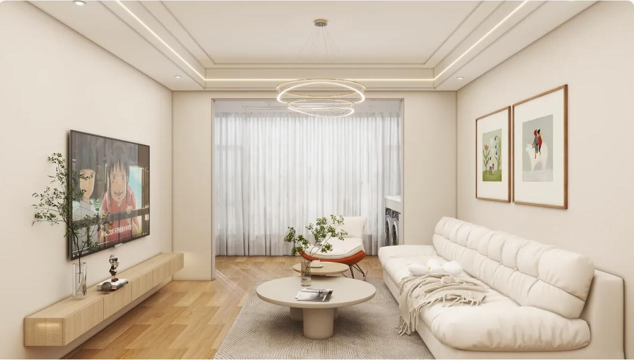 原木家具搭配暖白色布艺沙发,使整体空间更加柔和。一整面大落地窗,搭配白色砂质窗帘,使整体空间更加通透。