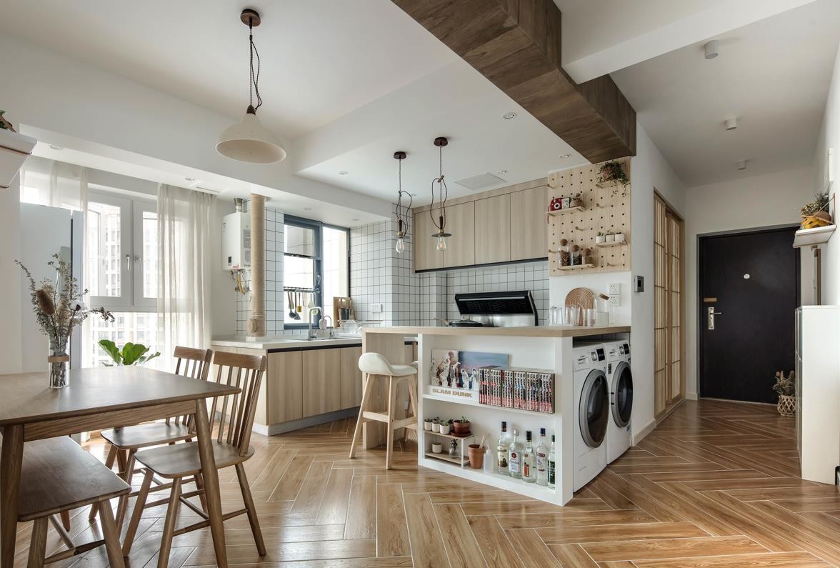 狭长的入户门厅在空间打开之后减少了视觉上的压迫感,过道的宽度只有1.2米,所以我们没有选择常规的满墙到顶的柜体,超薄半高鞋柜减少狭长过道给人带来的纵深感,同时满足鞋柜收纳需求,厨房原始墙体被拆掉,引光入室,不仅增加了过道的光感,烘干机、洗衣机藏进吧台柜子里,不占用室内空间,入户门厅右手边的合室格子推拉门增添了日式入户的感觉; 以原木亚麻色系+白色增加日系、MUJI感;不需要浓墨重彩的颜色;橡木色木