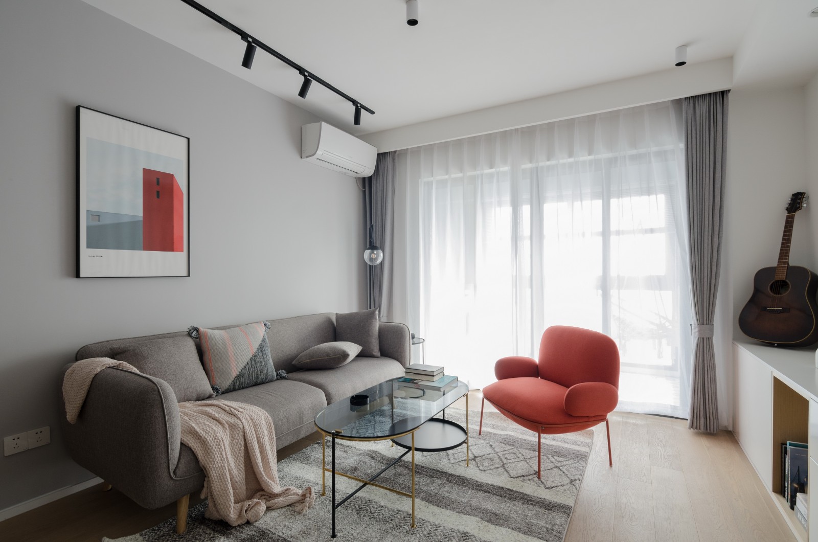 客厅做了最简单的无主灯设计,深灰沙发配上浅灰沙发背景墙,沉稳大气,橘红的单人沙发让整个空间突然有了滑坡的气息。