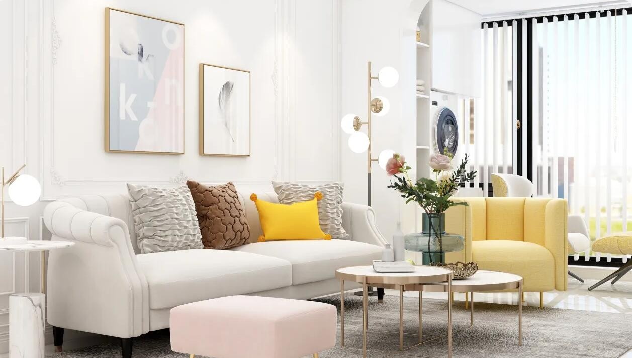 主题颜色为亮白色,搭配落地窗和灯光使整体空间更加通透明亮,采用亮黄色粉色等进行点缀,使整体空间不在单调。