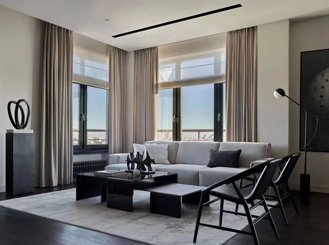 通过结合灰色和米色,设计师创造了一个功能性齐全的莫斯科80m²深色调公寓。大面积的窗户让光线充足,可以欣赏莫斯科的全景,调高的天花板使空间变得明亮。