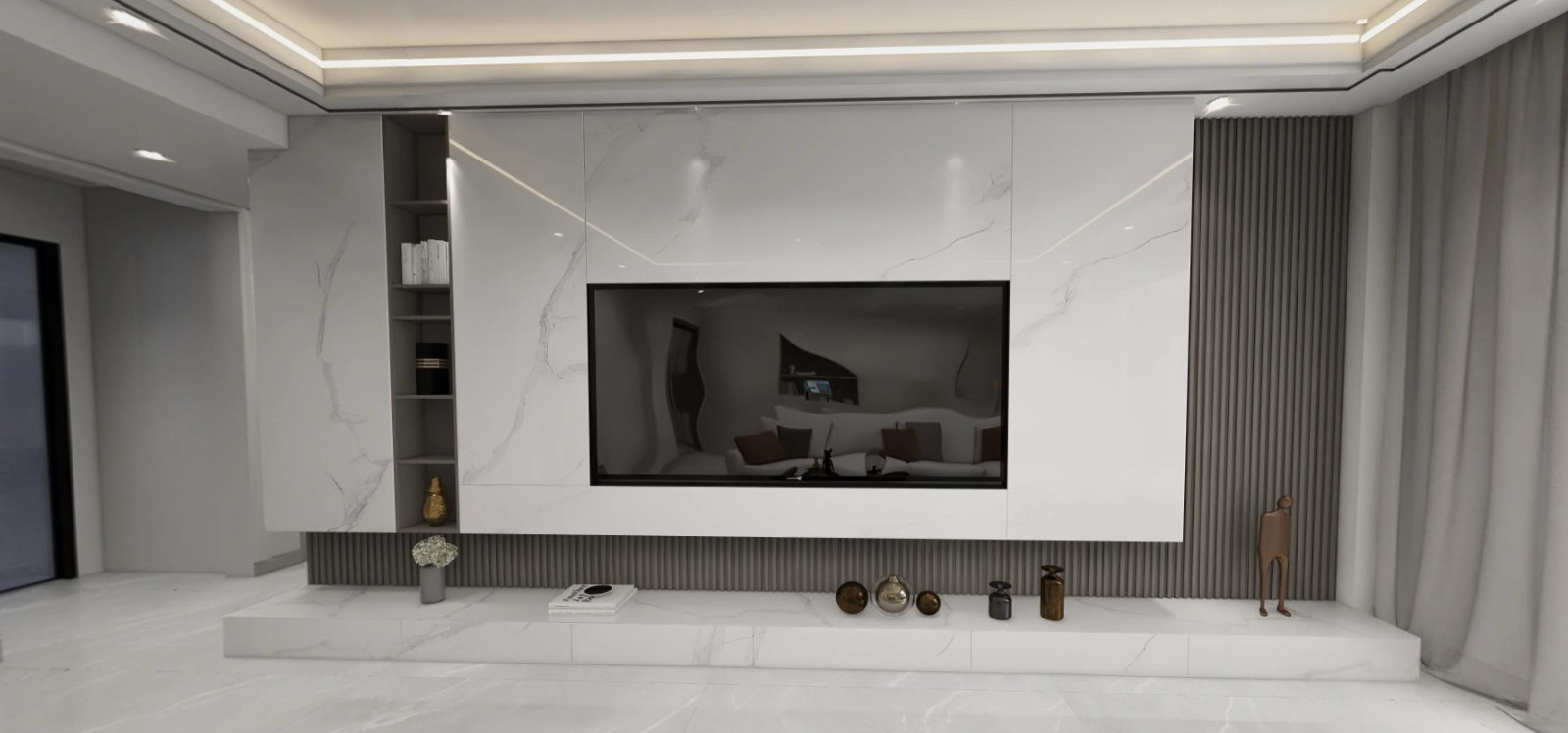 1.本次客厅的设计亮点在于利用岛台将客厅进行隔断,增加客厅的利用面积,整体以白色作为主色调,让整个空间看起来干净且明亮,电视背景墙选择岩板搭配木栅栏的设计,赋予整个客厅***感 2.阳台打通与客厅融为一体,增加整个空间的采光性,在视野上看起来更加的宽敞。 3整屋搭配纯白色的软装,使整个客厅的色调一致,有很好的视觉体验