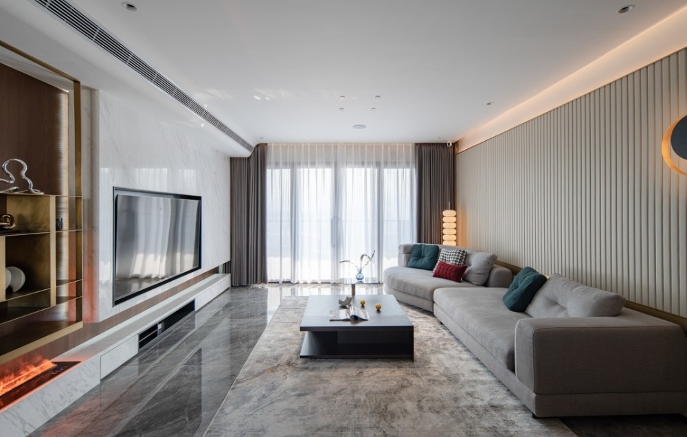 自然大气的灰白纹理交织一起,呈现流动的磅礴气势。胡桃木格栅和钛金边穿插其中,勾勒质感,延续奢华。