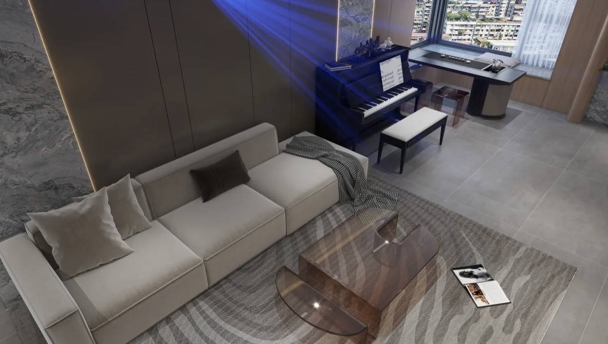 客厅的布局注重简洁和流畅性,强调空间的整洁和无冗余的设计。一张舒适的糯白色沙发,搭配白色顶面和咖啡色墙面,营造一个明亮而温馨的空间。采用一些色彩明亮的软装和艺术品来装饰,使整个空间更加生动有趣。