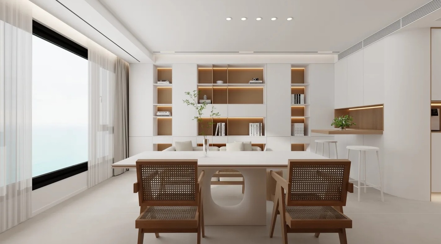 全屋以白+木的配色奠定舒适自然的空间基调,温润的柚木色让这个家显得更加柔和,不同区域之间以地台的形式,抬高空间、划分功能区,丰富视觉观感。
