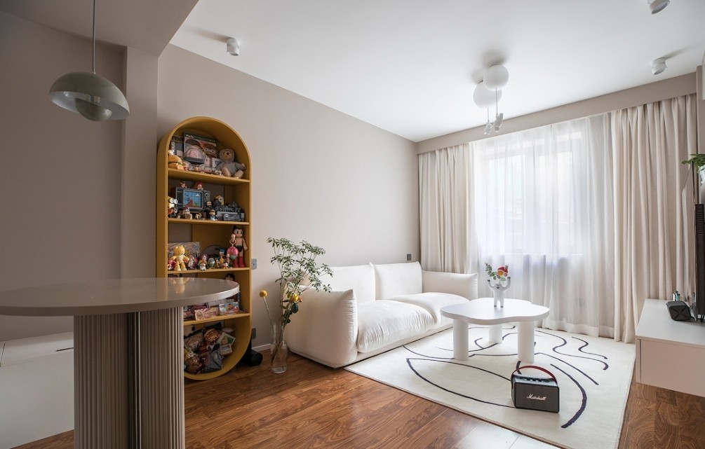 以收纳柜代替原有厨房墙体,不仅将厨房从狭小阴暗的房间解放出来,无形中也大幅增加房屋的收纳空间,L型布局,洗切炒流畅动线,与客厅更加连贯的格局,做饭不再是一个人的“战斗”。嵌入式线条灯照亮又长又窄的走廊通道,独特的几何造型结合弧形门洞,令整屋的立体感和档次得到大大提升。
