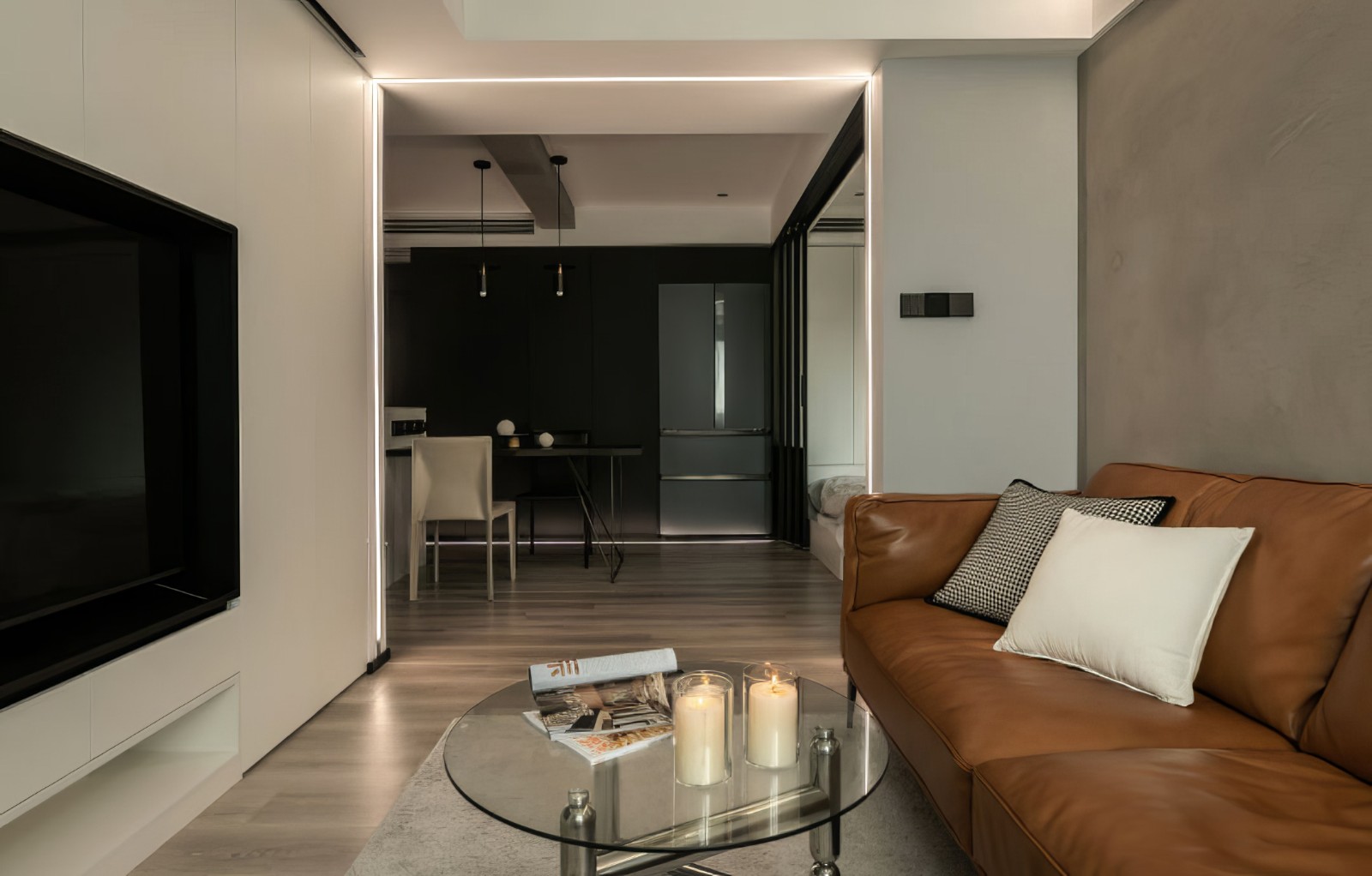 客厅选用了皮质沙发,为了显得空间通透,整个茶几也选用了玻璃的形式。配上到顶的白色通顶的柜门整个客厅空间显得格外整体。