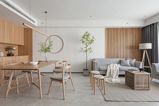 客厅沙发墙以原木为主,配合无主灯设计,空间温馨清新