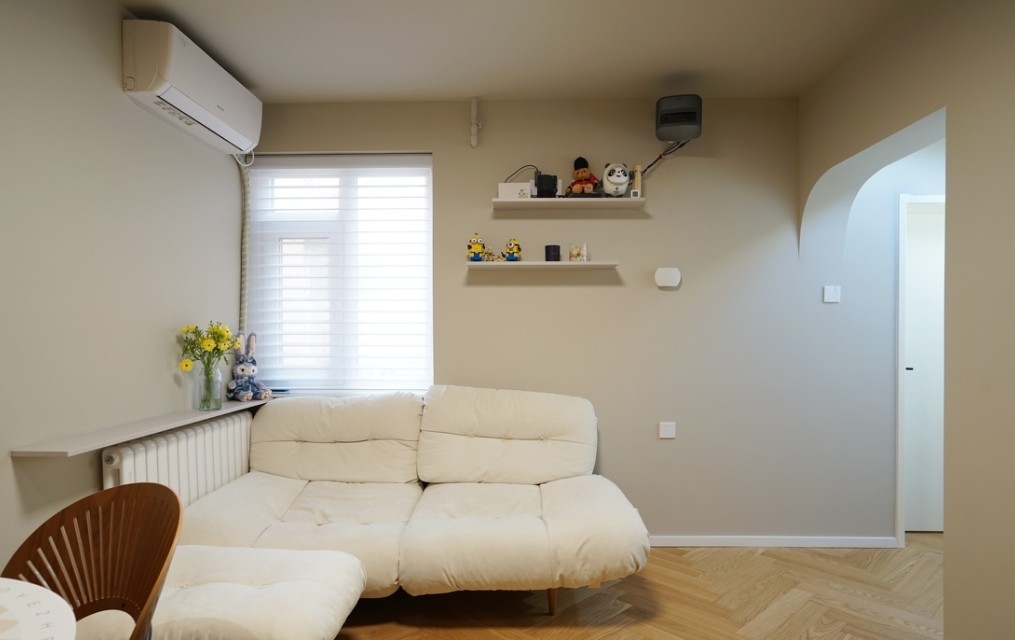客厅墙顶同色,减弱了层高低带给人的视觉感受,同时让整个空间的底色更加柔和有质感,增添了一股复古的气息。