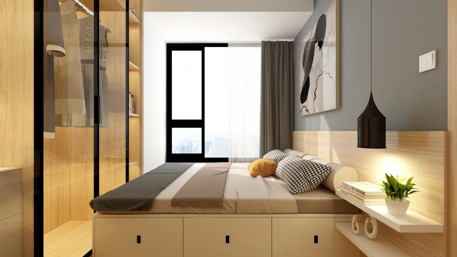 卧室有较大衣柜,可以更好的收存储藏,加上床头柜上的绿植,更凸显一丝别样的氛围。