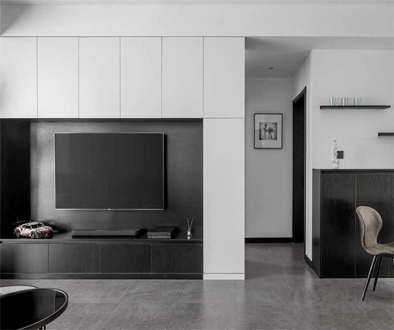 客厅墙面采用白色乳胶漆打底,地面采用深灰色砖增加层次感,柜体选择黑白为主色调,从视觉、触觉与其他空间立面形成秩序感。