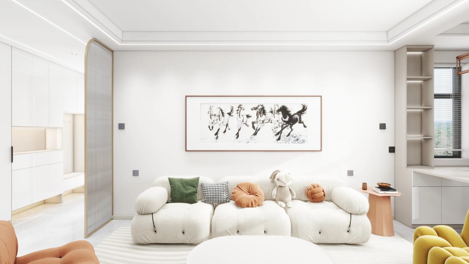 客厅中以白色为主要颜色,加上橙色和绿色的搭配环境风格更为突出,为整个生活环境增添了一丝氛围。