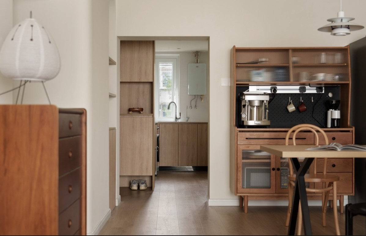 原木橱柜+木纹砖搭配,将原本寡淡的空间点亮,整洁又富有温暖,空间虽小却充分利用有限的角落,打造L型功能性厨房。