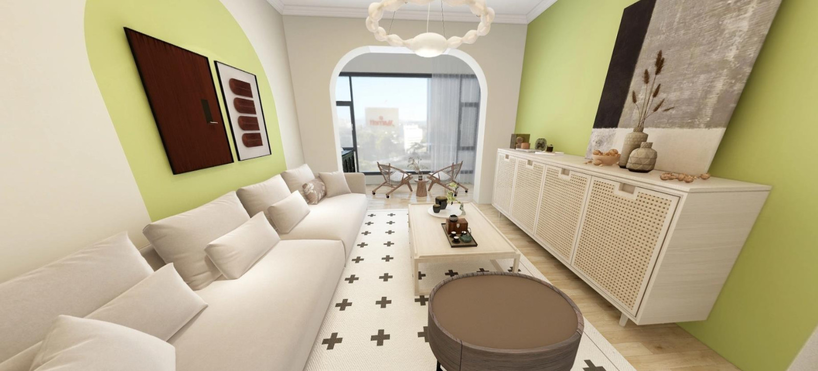 1.整屋采用田园风的设计风格,给空间营造出清新、自然的感觉,绿色乳胶漆通刷背景墙墙面,与白色进行色彩碰撞,空间层次感瞬间鲜明 2.电视背景墙没有喧闹的电视,以正面收纳柜为主,实用而精致,沙发背景墙加入了几何美学的设计,增加空间的***感 3.木地板通铺全屋搭配浅色系的沙发,营造出清新而又温暖的空间
