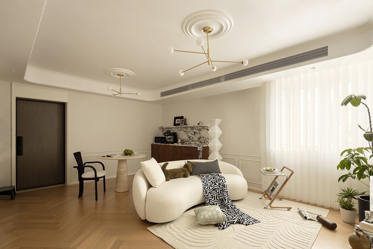 墙面留白,细窄石膏线线条适当点缀,恰到好处的色彩饱和度像初春里的一份法式甜品, 甜而不腻,有种不争岁月的温柔美感,轻复古法式简洁的空间外观,推敲经典永恒的细节。