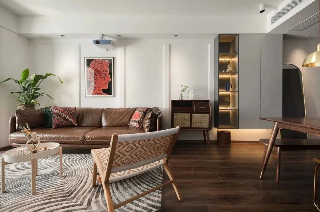 客厅中央铺贴黑白斑马条纹,搭配复古的咖色皮质沙发,背景用石膏线条勾勒出线框造型,以装饰画点缀,呈现出一种端庄***的精致感。