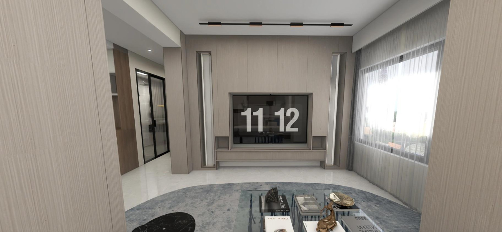 1.根据户型的特殊性,将客厅区域做隔断,增加其功能性,并将阳台进行封闭设计,客厅阳台为一体,拓宽了整体的空间,同时也保证了室内的采光性能 2.为了能让整体的效果美观,承重墙与电视背景墙采用岩板材料进行拼接装饰,营造出温暖***的氛围感,大平顶+筒灯设计增加了空间的光亮,不会压低层高显得空间更加光亮
