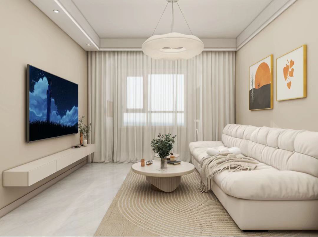 奶油风格的客厅注重简约、柔和、舒适的氛围。底色通常选用拿铁色或燕麦色,整体色彩饱和度较低,营造出被细腻奶油包裹的感觉