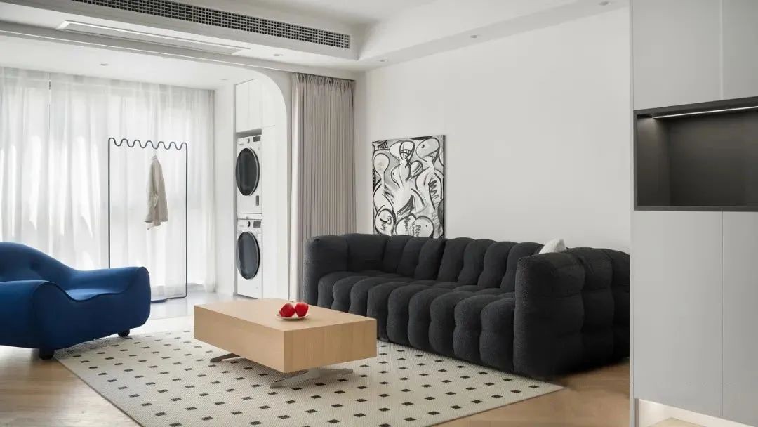 电视背景墙延续白色为基底,中间黑色凸显层次感,一侧增加通顶开放柜,为收纳空间扩容,一抹克莱因蓝亮色点睛,注入新鲜活力感。
