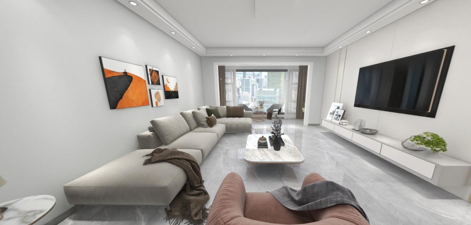1.阳台打开后为客厅引入更多的采光,空间感更加的宽敞明亮,浅灰色的地砖通铺全屋,无主灯的双眼皮吊顶设计,让客厅更加的大气,柔和的线条灯营造出空间的松弛感,让人能够放松 2.沙发背景墙通刷灰色乳胶漆,抽象派的墙画进行点缀,显得更有色彩感,电视背景墙采用白色岩板材料进行拼接,而电视则选择为嵌入式设计,与背景墙融为一体,且不会觉得突兀