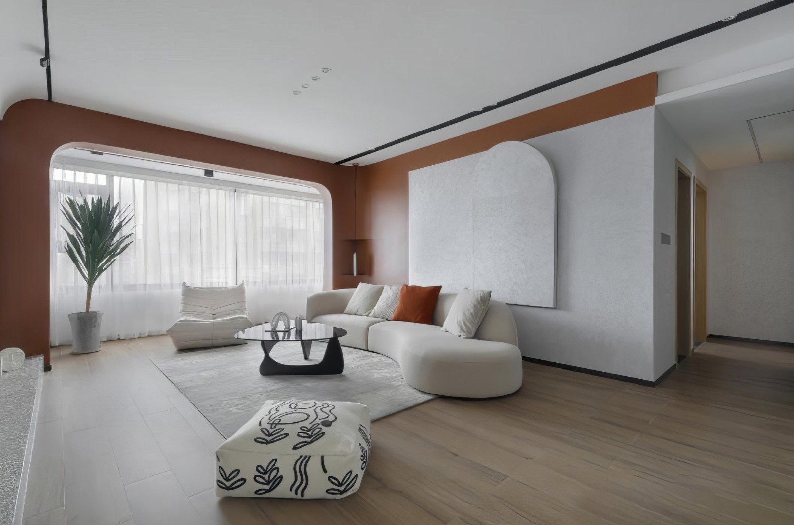 与阳台合并以后的客厅空间更加宽敞,通透的半窗,既打开了视野,也增加了通风。墙面有橘色点缀,沙发上同色系抱枕呼应,空间的美感被展现得淋漓尽致。