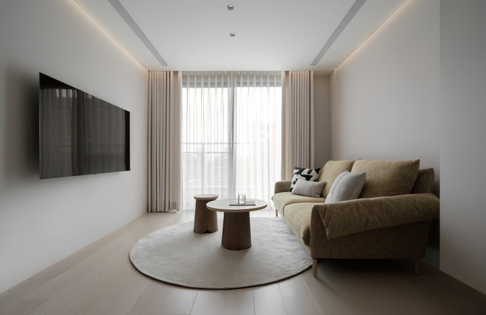 沙发前方是一对高低组合的圆形木质茶几,简单而又雅致,两个茶几还能分开使用,放沙发旁、放阳台或卧室、都很合适,一物多用,灵活百变。