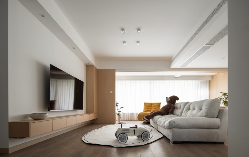 不能打拆的承重墙体,用电视柜同色木饰面包裹,弱化了墙体生硬的厚重感,色调统一整体,视觉上更流畅。 收藏
