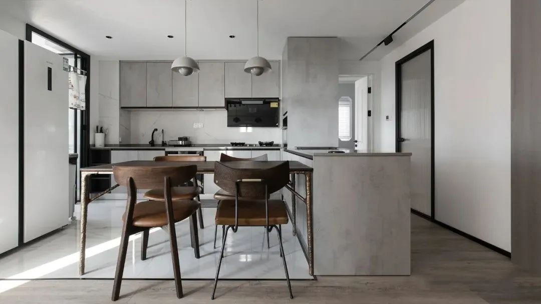 餐厨空间紧密相连,延续了整体的简约素雅,岛台增加操作台面,奢石与木质的运用,不同材质的碰撞呈现一种简练的***感。