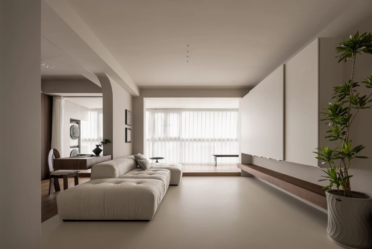 区域间的有机互动总会留给空间更多的遐想与动容,整面朝南阳台包入室内扩容空间,阳台不做分段式处理,串联客厅、主卧、书房三处空间,家居动线自由灵动。阳台以地台形式高于内部空间安然处之,满足空间的开阔感之余,享乐于阳台的恣意舒展。
