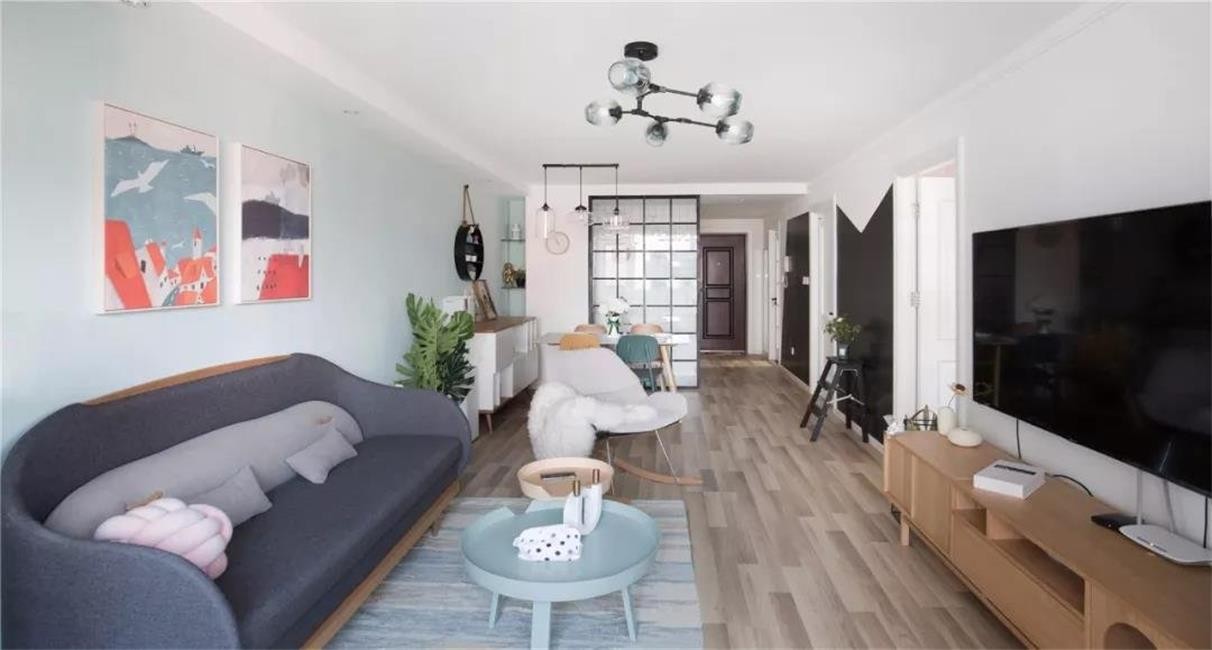 进门的右手边是一排组合式鞋柜,底部做了留空和藏光设计,方便放常穿的鞋子,同时也增加了玄关空间的温馨感。另外,玄关柜与木地板的色彩也保持一致,增强了室内和谐统一的质感。穿过玄关,走过厨房卫浴间,便来到了客餐厅。客厅面积不大,在设计上尽量追求简洁,淡蓝色的沙发背景墙上挂两幅色彩鲜明跳脱的手绘装饰画,一眼看过去满满的文艺雅致感。