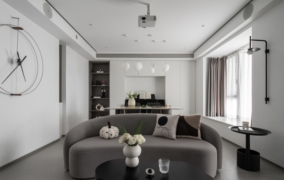 在深入了解业主对客厅的需求之后,设计师将这个空间规划成横厅格局,用投影代替电视,精简家具、材料和颜色,还原一个温柔清爽的家。