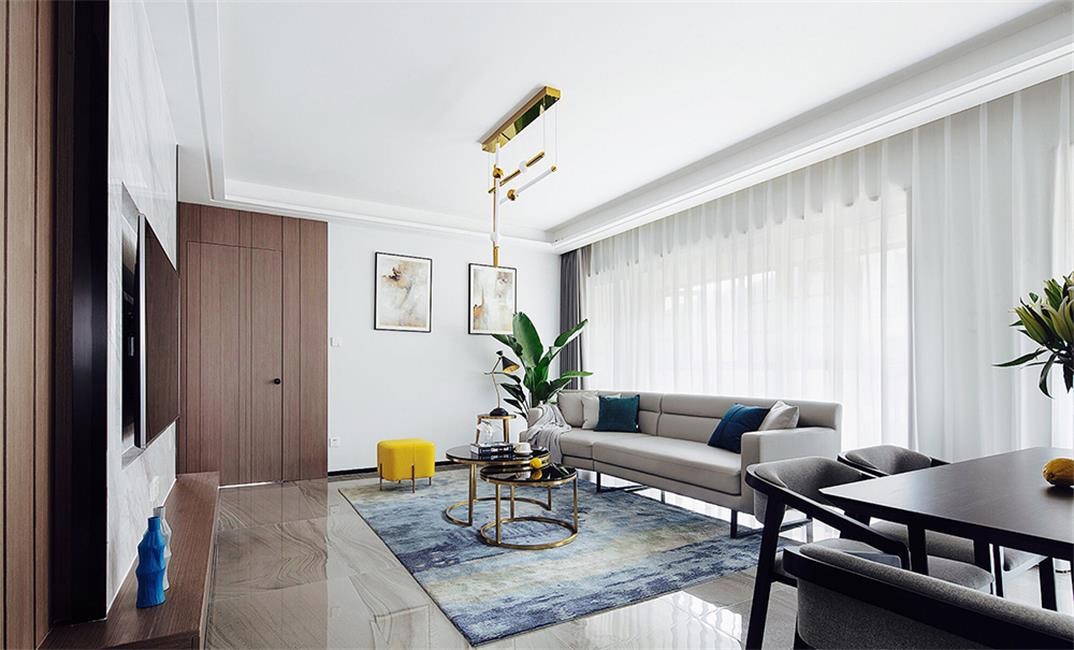 客餐厅相连,使空间看起来更加宽敞明亮,超大的彩色地毯,就是两个小宝贝平时一起玩乐的地方。整体护墙和石材的组合,简洁大气,地面不规则的流沙纹路地砖时尚又灵动!沙发的转角位置,放置了一盆阔叶绿植,给整个氛围增添了不少精气神儿……