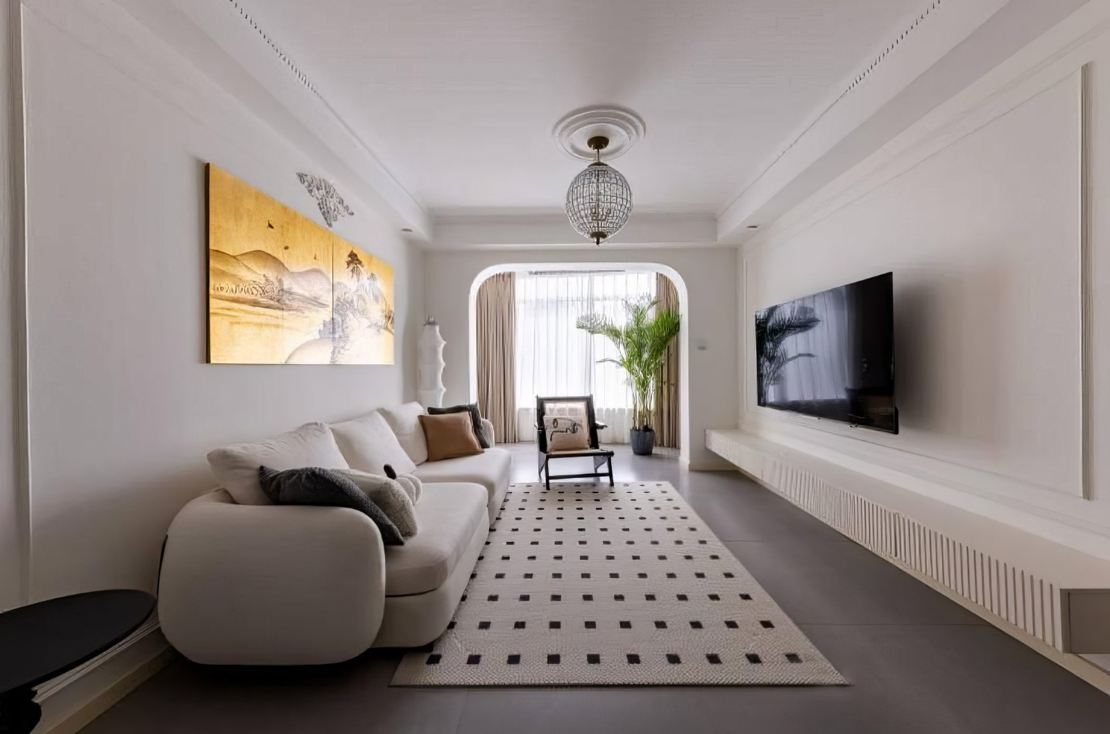简单的电视背景墙,不多加修饰,营造清爽的空间氛围享受。造型纯粹的悬空柜,可收纳各式各样的小物件,保持空间整洁干净,下方方便日常清洁打扫。