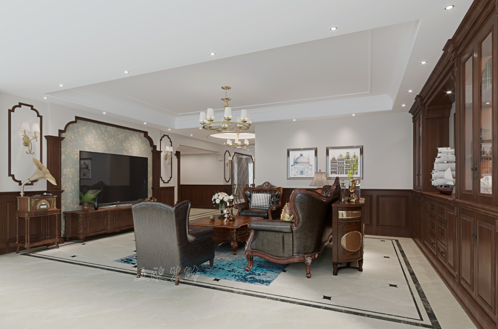 客厅的主色调是白色,与造型优雅的胡桃木色边框组成休闲又古典的美式风格,家具的造型寻求绮丽、高雅的古典风格。整体看上去华丽复古又带着休闲的气息。