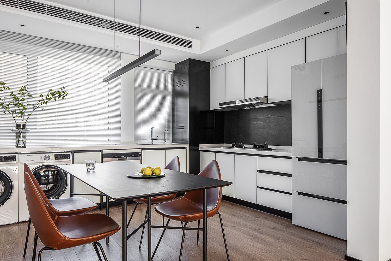 纯白造型的定制橱柜,黑色线条作为造型的一部分,完美的表达了现代风厨房的侧重点,注重功能简化装饰,在空间区域的划分上更加清晰。空间宽阔而不狭窄,整体风格和整个家和谐的融为一体。
