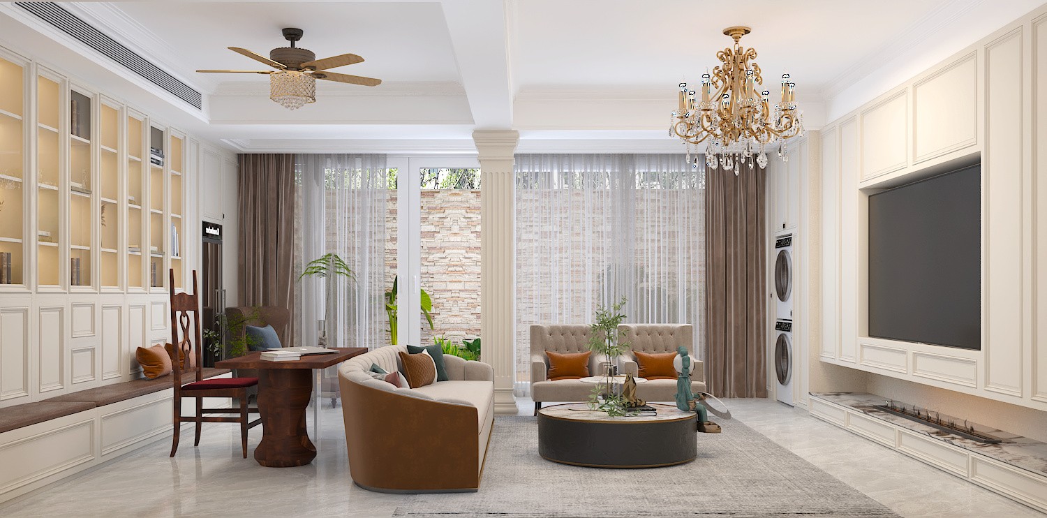 客厅的美式吊灯格外显眼,电视柜的造型和书柜的造型,搭配上合适沙发和书桌,美式风情尽显无疑。