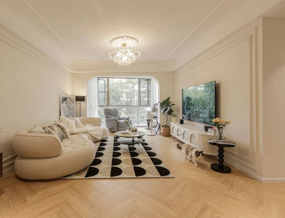 屋主喜欢软绵绵温馨的感觉,风格上选择了法式奶油风,柔美温馨又浪漫。藏不住的奶油质感,开启两人一猫的法式浪漫生活。
