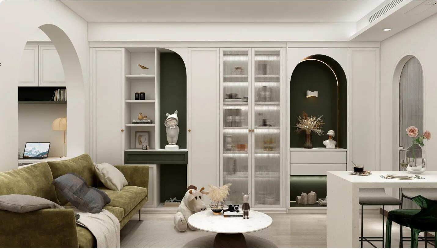 整体空间比较小,但磨砂玻璃有效提升了整体空间质感。墨绿色沙发作为整体空间的点睛之笔,提升了整体空间的氛围。
