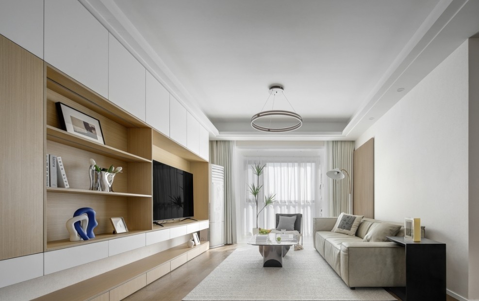 客厅采用白色与木色的主色调,将阳台移门拆除打通后,阳台作为客厅的补充,空间上更加通透。阳光透过纱帘照射进屋内,带来一丝暖意,呈现出一种简约舒适而从容的空间氛围。