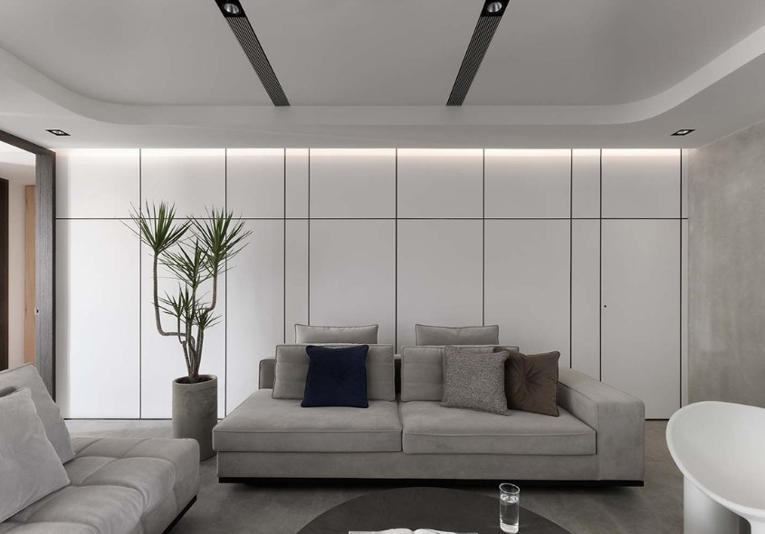 沙发背景墙做成白色线条护墙板,其中右侧墙角处做有通往卫浴的隐形门设计,关上门空间整面墙统一又整洁。结合天花板的圆弧形吊顶,空间增添不少柔美感,再搭配上无主灯设计,射灯和线性灯光的设计为空间氛围感奠定基础,提升整体的空间感。