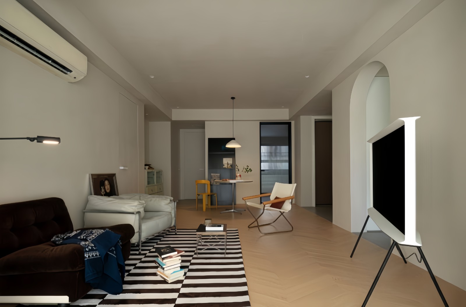 ,在客厅设计上我们对原来的吊顶进行拆除,做了弧线的处理,营造无主灯氛围。墙面与顶面,采用复古感的艺术涂料,肌理更加有质感;考虑到挂机空调是白色的,我们现场使用喷漆涂料,进行做旧,以确保在整个空间中不突兀。