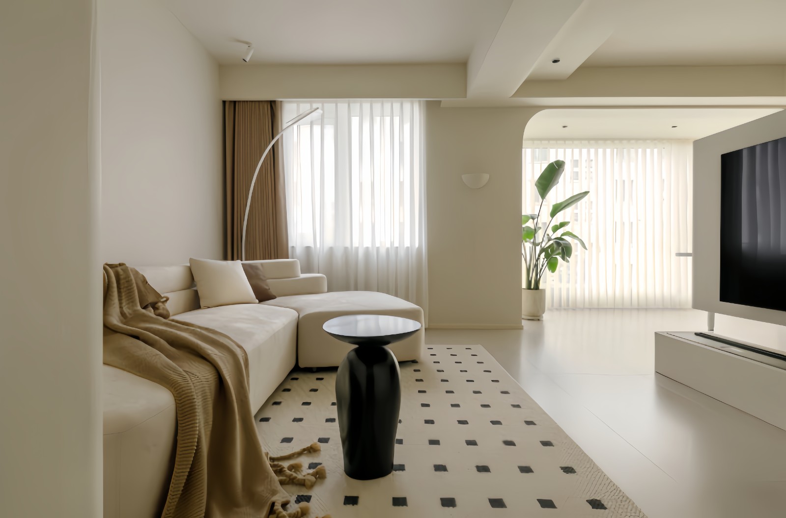 客厅是一个纯粹无负担的空间,软装陈设也以接近的米色系为主,观感极简,又不乏温柔细腻。半墙电视背景墙两侧均留有间隙,西厨与客厅仍可互通有无,彼此对望的视角,少了些直白,多了几分含蓄内敛。