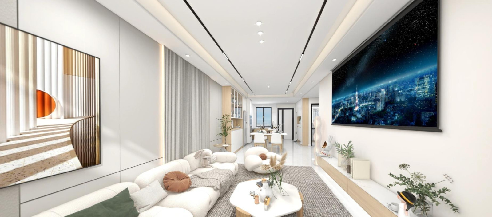 1.乳白色的乳胶漆通刷墙面,并作为空间的主色调,显得空间宽敞明亮,顶部双眼皮吊顶搭配上黑色的灯带设计,空间色彩层次感分明,黑白搭配显得更有***感 2.由于业主两人对电视的需求量较小,所以选则了投影仪,需要用的时候可以放下来,不用的时候可以隐藏在顶部,不影响美观,同时还很实用 3.软装则选择纯白的云朵沙发搭配灰色亚麻地毯,整个空间简约***,落地式的吊柜设计,增加了收纳空间,花草的摆放衬托出空间