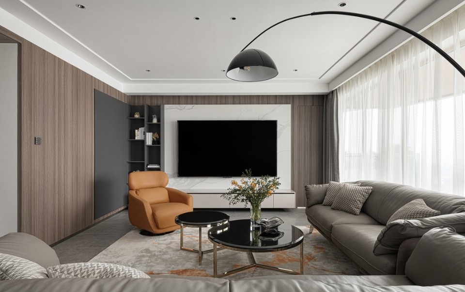 经典的黑白灰色调,给人以沉静内敛的感觉,让人在空间中能够更好的舒缓心情。橙色的沙发又为空间增添了一丝明媚的亮色,使之富于温度而不至于沉闷。