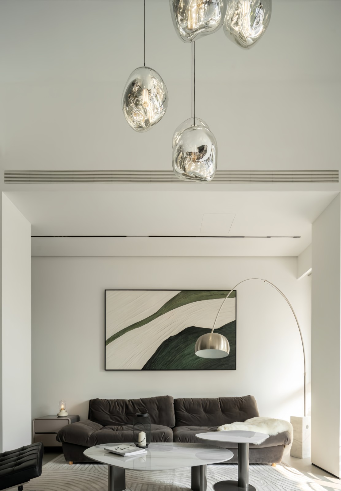 家具的布置也尽显现代主义风尚,深灰色沙发与浅灰地毯融洽一体,浅绿色花纹的大理石三角茶几与墙上深绿色画幅相呼应。