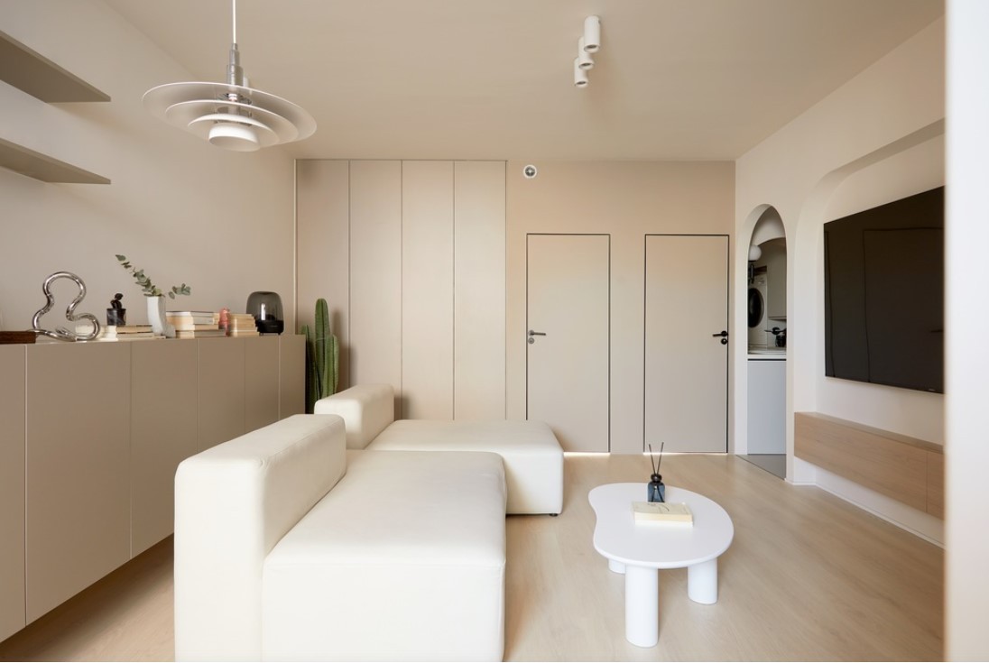 镜面移门另一端,是最有烟火气的厨房,厨房虽然仅有 4 ㎡多,但可谓是“麻雀虽小,五脏 俱全”,在合理的洗-切-炒的动线下,不仅有嵌入式洗碗机还放下了大容量的双开门冰箱。
