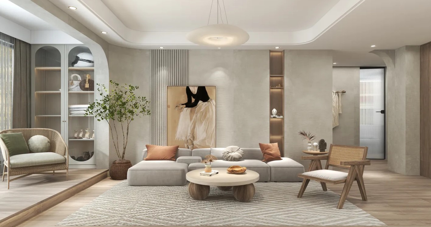 原木与侘寂,让理性与温情携手。本方案为四房两厅奶油侘寂风格,套内面积约125㎡。屋主为夫妻二人,性格豁达开朗,偏爱平静柔和的侘寂风格.